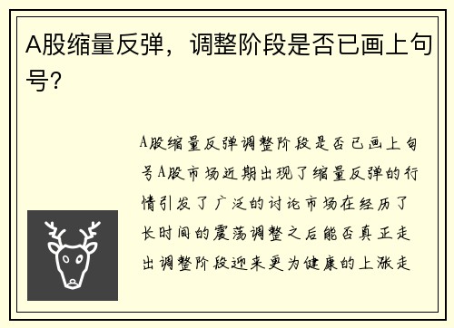 A股市场近期出现了缩量反弹的行情,引发了广泛的讨论。市场在经历了长时间的震荡调整之后,能否真正走出调整阶段,迎来更为健康的上涨走势?本文将从多个维度进行分析,探讨A股当前的市场环境、缩量反弹的背景与特点、调整阶段的终结标志、以及未来可能的市场趋势,帮助投资者更好地理解当前市场的形势。