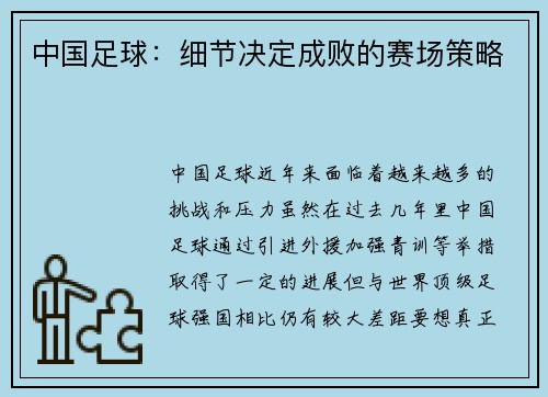 中国足球,近年来面临着越来越多的挑战和压力。虽然在过去几年里,中国足球通过引进外援、加强青训等举措,取得了一定的进展,但与世界顶级足球强国相比,仍有较大差距。要想真正提升中国足球的整体水平,细节是决定成败的关键。本文将从四个方面探讨中国足球在赛场上的策略,从球队战术、球员素质、教练领导力以及球迷支持四个角度,深入分析细节如何影响比赛的最终结果。