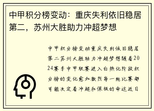 中甲积分榜变动:重庆失利依旧稳居第二,苏州大胜助力冲超梦想 随着2024赛季中甲联赛进入白热化阶段,积分榜的变化愈加激烈,每一轮比赛都可能决定着冲超和保级的命运。近日,中甲联赛又发生了几次重要的变动,重庆队在一场失利后依旧稳居积分榜第二,而苏州队则凭借一场大胜,坚定了他们冲超的信心和决心。本文将从各支球队的表现、比赛细节以及接下来的赛程等多方面分析当前中甲积分榜的变动,并探讨重庆队和苏州队在冲超道...